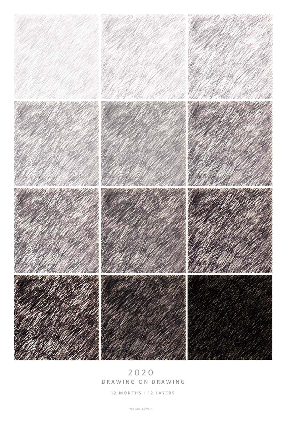 Twelve drawings; with a 'layer of drawing' being added each month as the year unfolds.