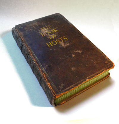 A small leather book. The interior pages are made from consecration wafers, and the book is displayed in a glass case, along with the story of its discovery.