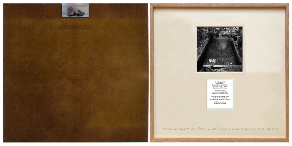 Left: Earth and water (from St Dyfnog's Well) on canvas, over a charcoal diagram of the well,